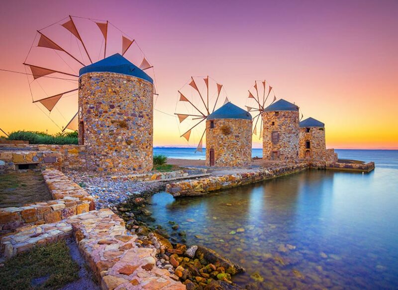 Yunanistan’ın kültürel ve tarihi açıdan en zengin adaları arasında yer alan Sakız Adası, namıdiğer Chios, tam bir kültür hazinesi! Burada Osmanlı mirası mermer oymalı çeşmeleri, meşhur yel değirmenlerini, Sakız Kalesi’ni ve dahasını keşfedebilirsin. Korsanlardan korunmak için sokakları labirent gibi tasarlanan Mesta ve Pirgi köyleri de geleneksel izleri takip etmeyi sevenler için unutulmaz olabilir.